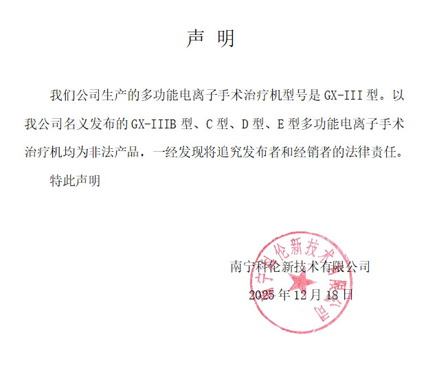 产品名称:多功能电离子手术治疗机,生产企业:南宁科伦新技术有限公司,注册号:桂械注准20182010070,广告批文:桂械广审(文)第260223-04455,